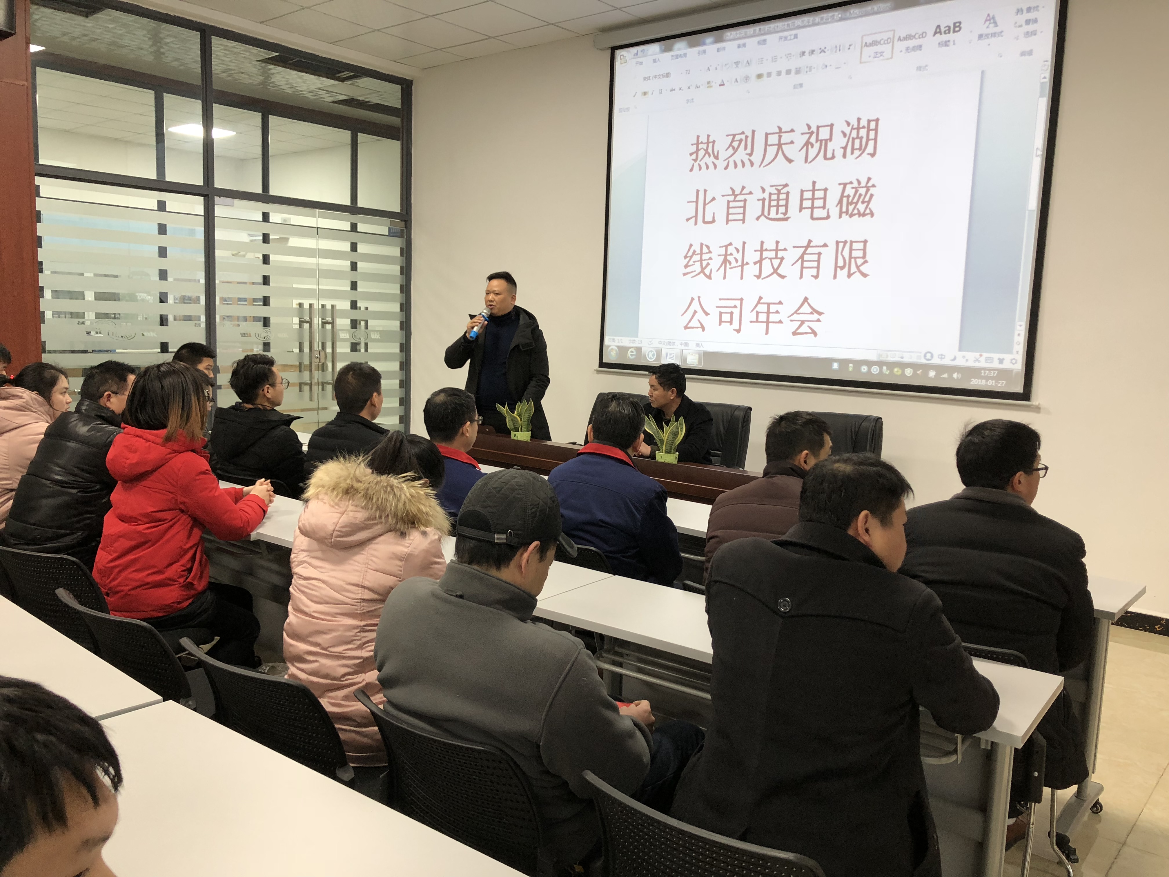 2018年1月27日,公司在多媒體會議室舉行了2017年年會。雖然開廠短短幾個月,但我們各項設施、人員已配備齊全。這是湖北首通第一個年會,同樣也是湖通人的第一個年會。會上,我司總經理韓照虎首先總結了一下2017年我司建廠到正式投產完成的一系列工作情況;其次,匯報了2018年度工作計劃,新的一年工作部署;最后,歡迎大家來到湖北首通,讓我們成為一家人。